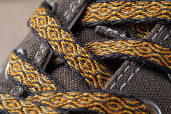 For pin-loomers Gabi van Tassel’s Raffiametry Placemats showcase how to use raffia on a pin loom, while Kay Meador’s Ebb & Flow Pillow takes advantage of slow striping yarns to create a soothing, painterly color-block pillow cover. Jennifer Williams inkle-woven Relaxation Eye Cover brings the spa experience into your home with silk, lavender, and flax seeds. And for tablet weavers, give your high tops a boost of color and pattern with John Mullarkey’s tablet-woven Astounding Shoelaces.