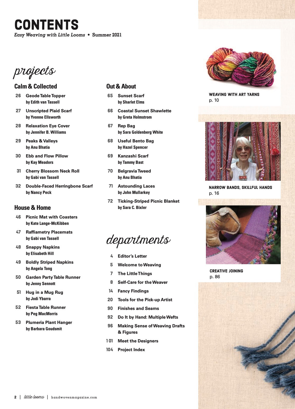 The 2021 Summer issue of Easy Weaving with Little Looms delivers 23 projects designed to calm your soul, beautify your home, and add a dash of handwoven panache to your wardrobe. All of the projects can be woven with pin, inkle, and rigid-heddle looms, or weaving tablets. There are projects for every ability level, from beginner such as the Boldly Striped Napkins, woven in plain weave by Angela Tong, to the more advanced Double-Faced Herringbone Scarf by Nancy Peck which uses two heddles, a heddle rod, and a pick-up stick to weave twill.