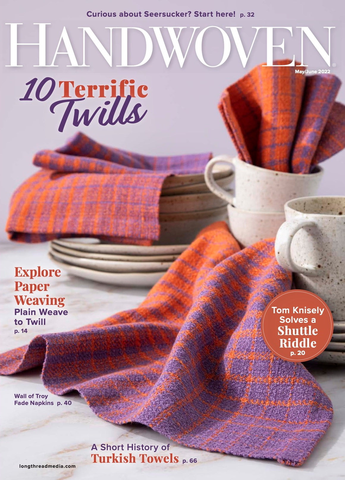 Learn about Bedford seersucker, an unusual twill, get the backstory on Turkish towels in Traditions, and go on a journey of discovery with Tom Knisely in his Notes from the Fell as he explores a lesser used weft: poppana. Susan Bateman and Melissa Parsons continue their Best Practices series with tips for fixing mistakes on- and off-loom, and Deb Essen describes how to sell your handwovens, which as you’ll find out, isn’t just about pricing.