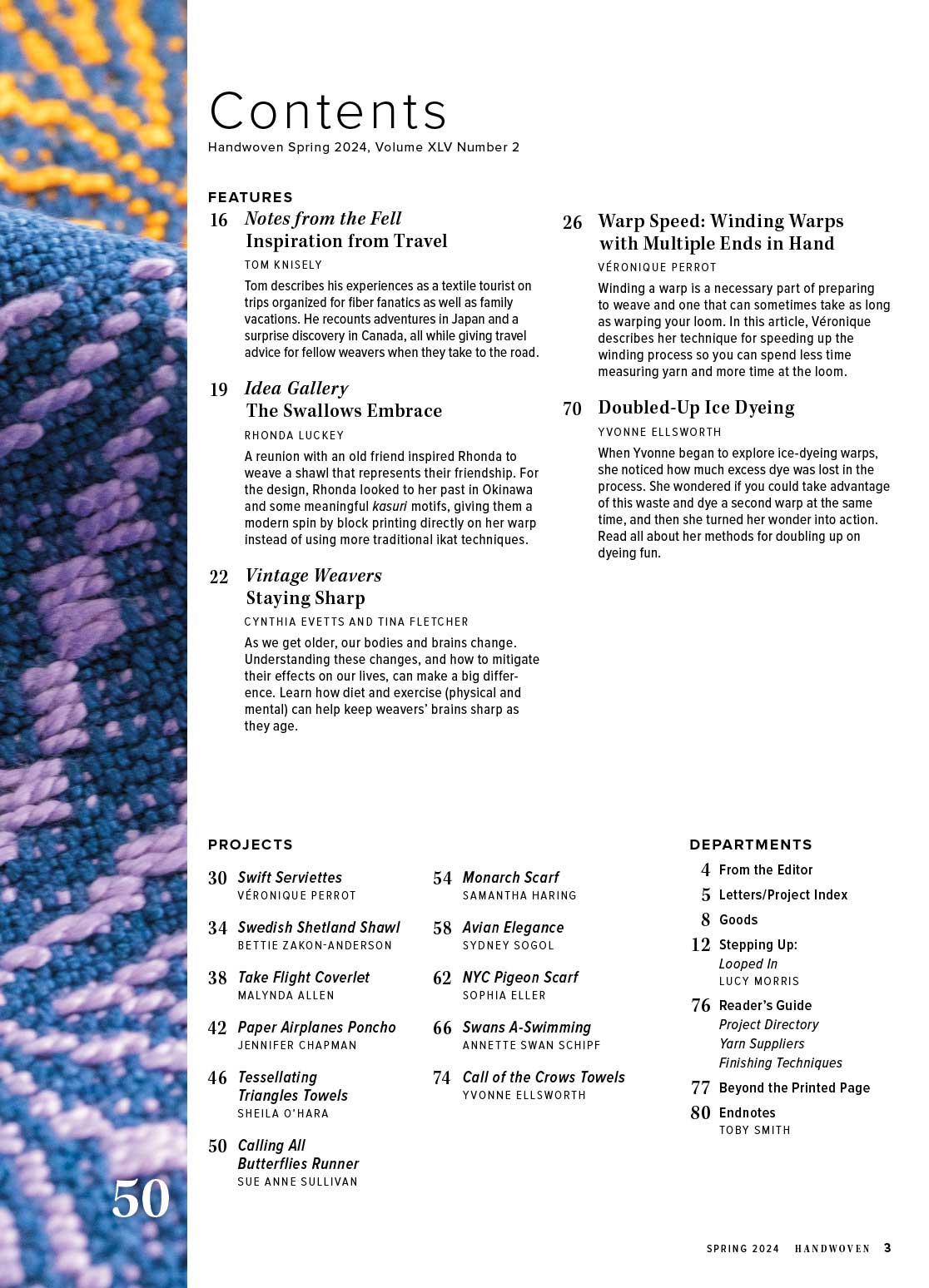 Flying inspired the eleven projects in this issue that honor butterflies, birds, planes (both real and paper), and even the passage of time. Flight as a metaphor can also be found in many of the articles, whether it’s the Idea Gallery about printing swallow motifs on a shawl warp, an Endnotes about a flock of Noh Coats, or saving fleeting time through unique approaches to warping. In Notes from the Fell Tom Knisely talks about the inspiration he has found through travel and offers tips for how to use travel to inform your own weaving designs. You’ll learn how to keep your mind sharp in Vintage Weavers, how to use one ice-dye setup for two warps, and how a reader is helping her husband stay connected through weaving potholders.
