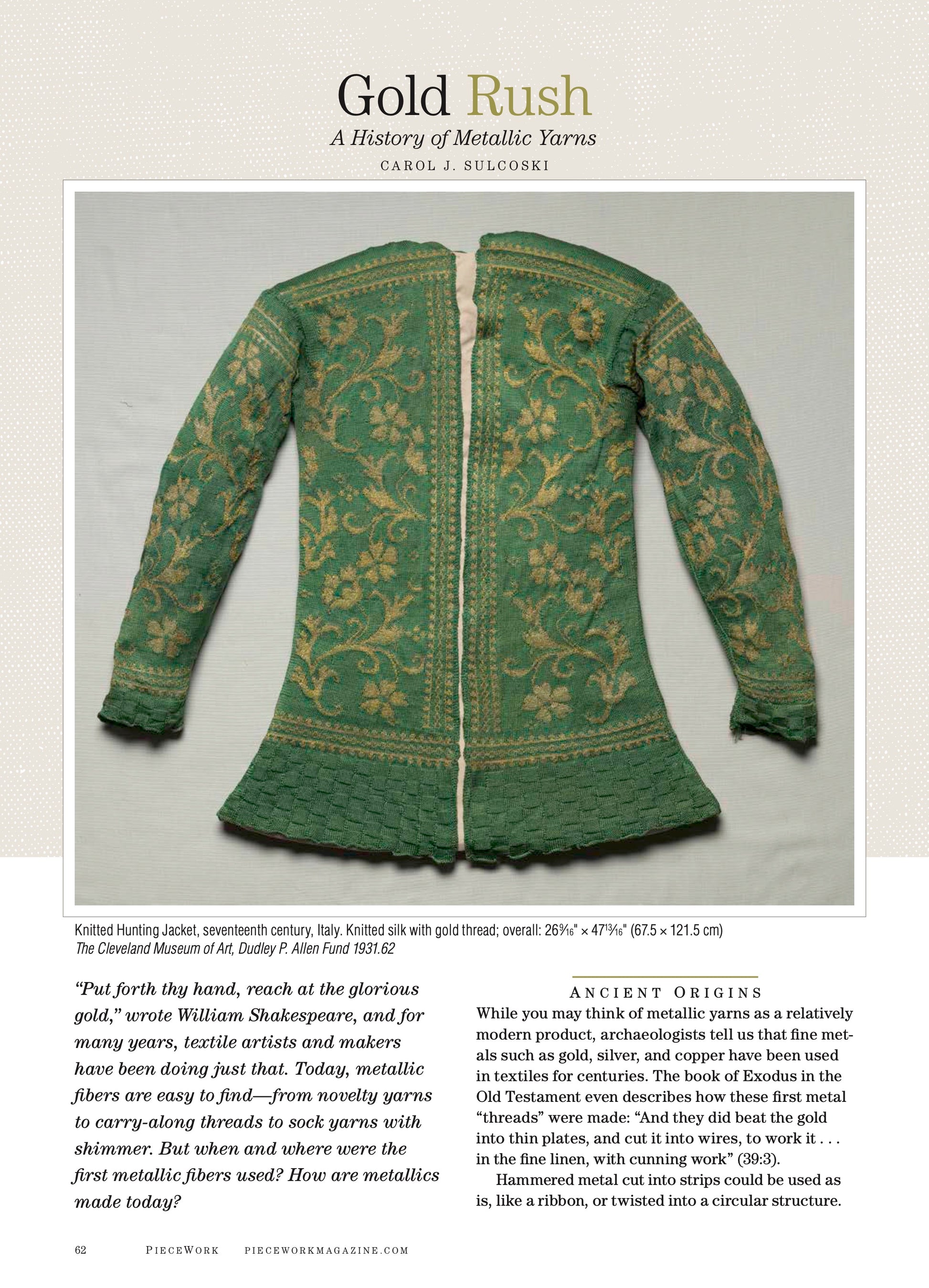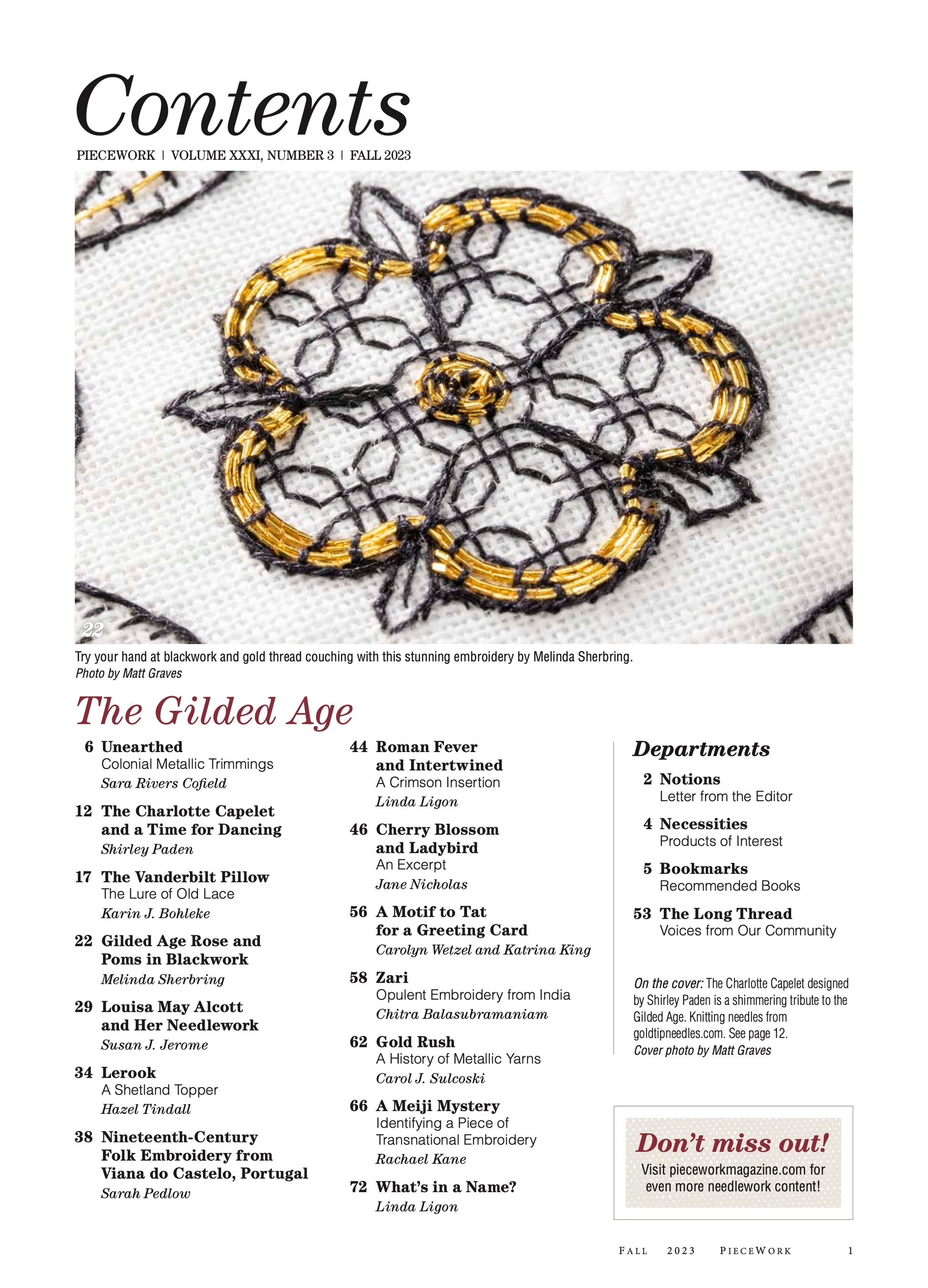 Don’t miss our 30th Pearl Anniversary issue! From golden threads to architectural detail, PieceWork Fall 2023 is brimming with Gilded Age inspiration. Be transported to a time where success was heralded with lavish displays of indulgence and glitter, and the wealthy could revel in the best of tradition and innovation.
