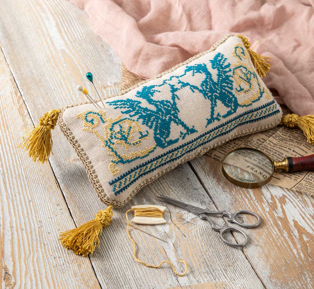 - Cross-stitch Deanna Hall West’s magical pincushion that features a pair of frolicking Victorian dragons