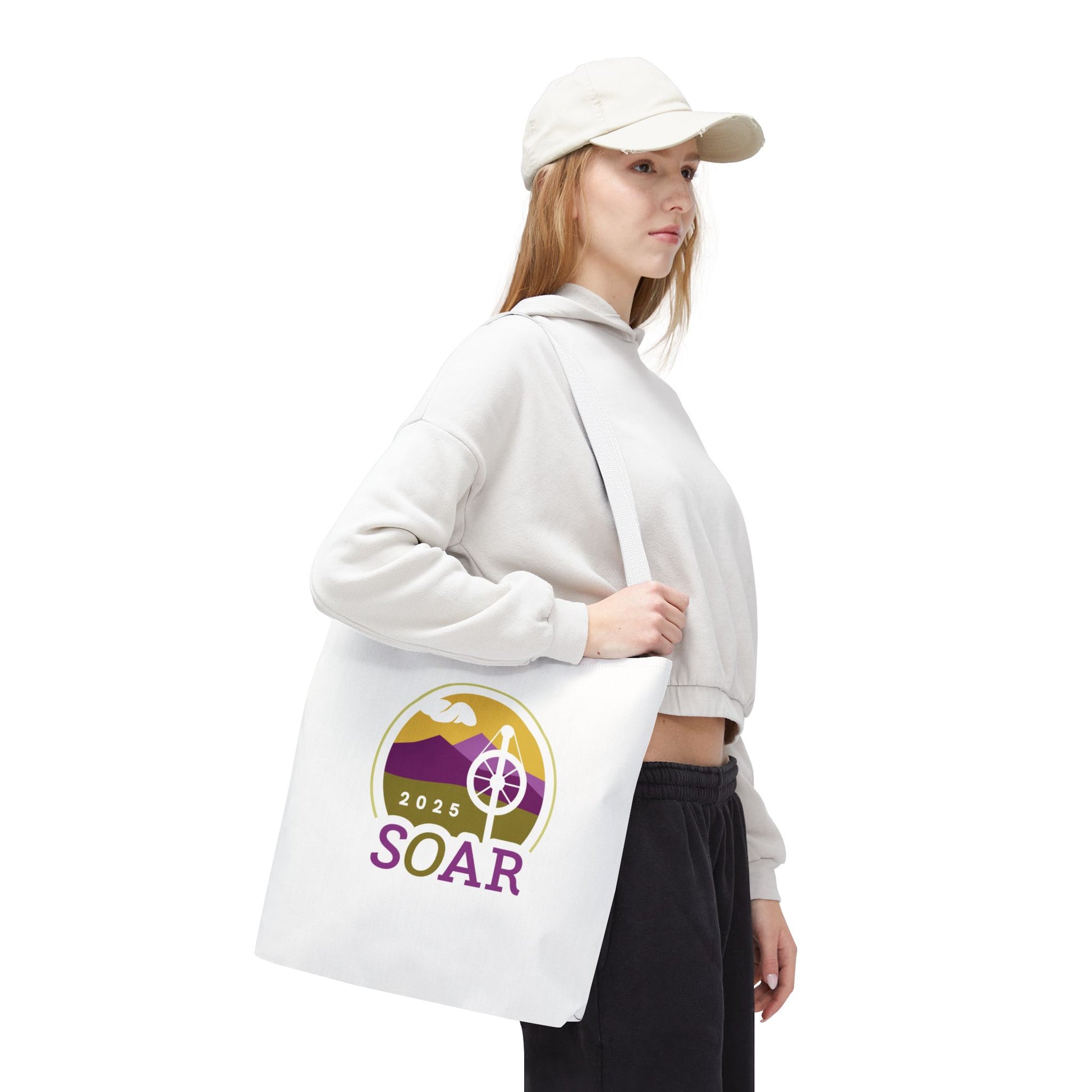 The SOAR tote bag is perfect for carrying fiber, spindles, knitting needles, and more. Ideal for spinners looking for a stylish and practical way to transport their supplies. Great for everyday use or as a gift for SOAR lovers.