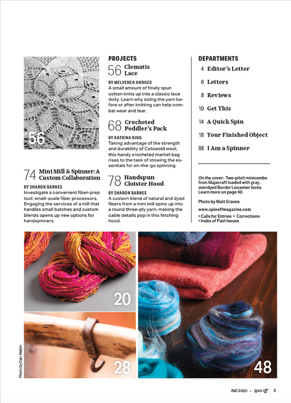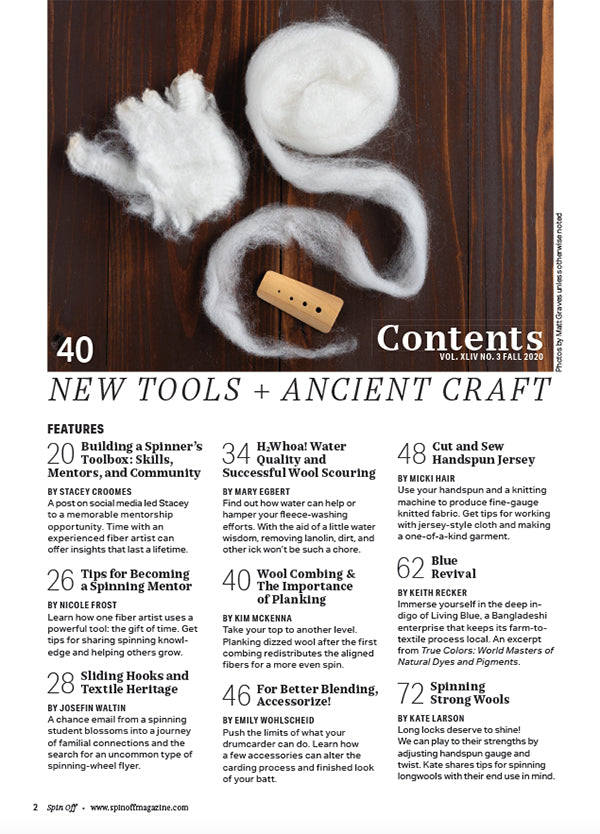 Feed your creativity with handspinning tools both old and new in the Fall 2020 issue of Spin Off, our Ancient Craft, New Tools issue. Learn why planking combed top helps you spin more evenly. Explore the fiber-processing advantages of enlisting the help of a mini mill. Plus, get tips for making jersey-style cloth with your handspun using a knitting machine.