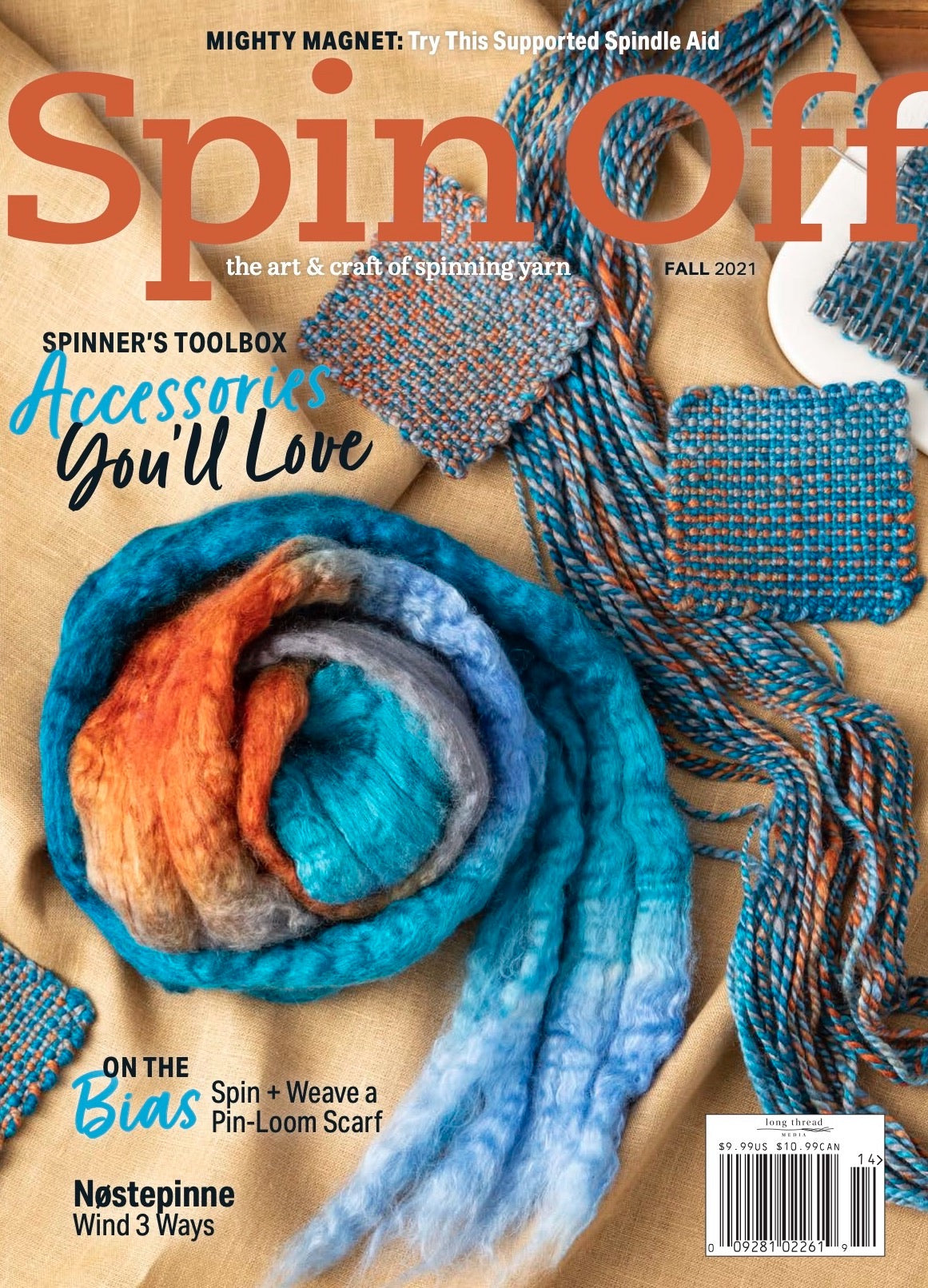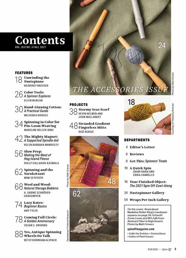 Accessorize your spinning with the Fall 2021 issue of Spin Off! Our annual tool issue explores all the extras that smooth your spinning path. Learn three ways to wind center-pull balls using a nøstepinne from Heavenly Bresser and see how each method impacts your yarn. Madeline Keller-King investigates color and yarn design for pin-loom weaving, and John Mullarkey and Devin Helmen share a great scarf project for pin-loom squares working on the bias. Melvenea Hodges makes ginning cotton by hand easy using basic tools. From artisan-crafted tools to DIY solutions to resources for expanding your color skills, Spin Off is brimming with must-have tools this fall!