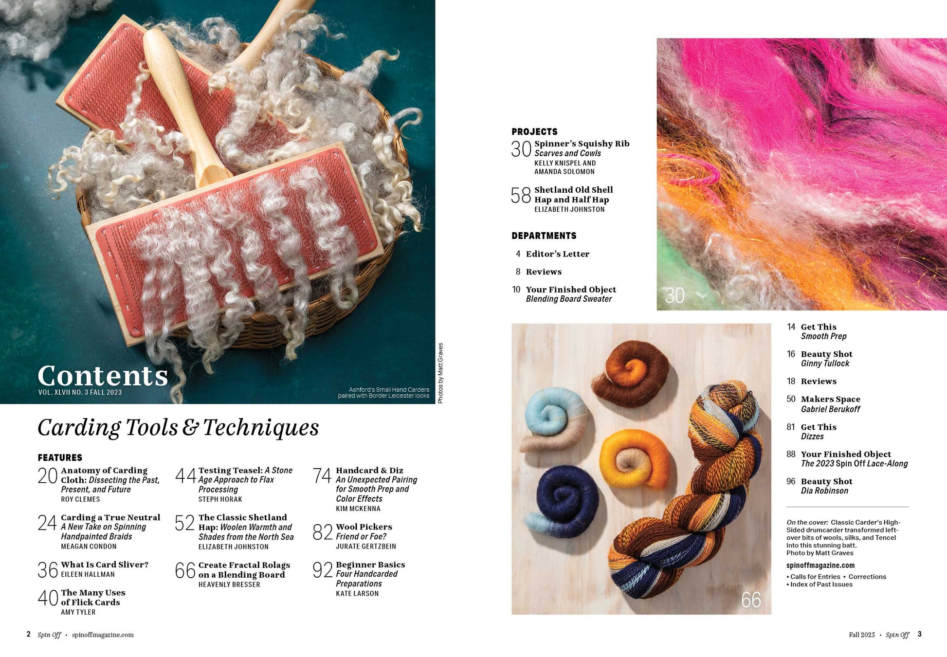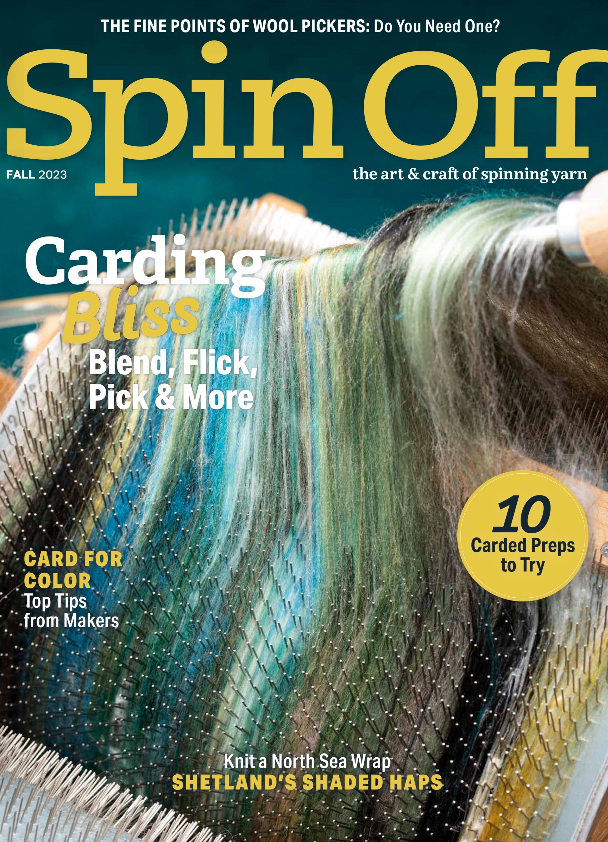 Carding cloth—found on handcards, drumcarders, flick cards, and blending boards—is a spinner’s best friend. In this issue, we celebrate all things carding! You’ll learn from Roy Clemes how carding cloth is made, and then try creating five different fiber preparations with handcards. Read a Shetlander’s history of the classic woolly hap and make your own. See Amy Tyler’s collection of flick cards and learn two favorite techniques. Then, explore a stone-age approach to preparing flax for spinning, a spinner’s super squishy rib, wool pickers, and more.