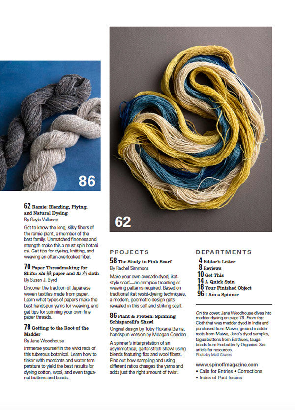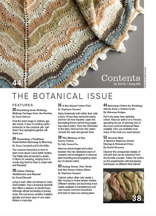 As temperatures begin to rise, embrace the bounty of the warmer seasons with Spin Off Spring 2020, The Botanical Issue. Don’t wait for tender seedlings to sprout! Get a head start and read all about working with plant fibers and more. Uncover the history of Sea Island cotton. Explore the unexpected shades produced when dyeing with lichens, avocados, and madder root. Get to know the long, silky fibers of ramie. Features include:
