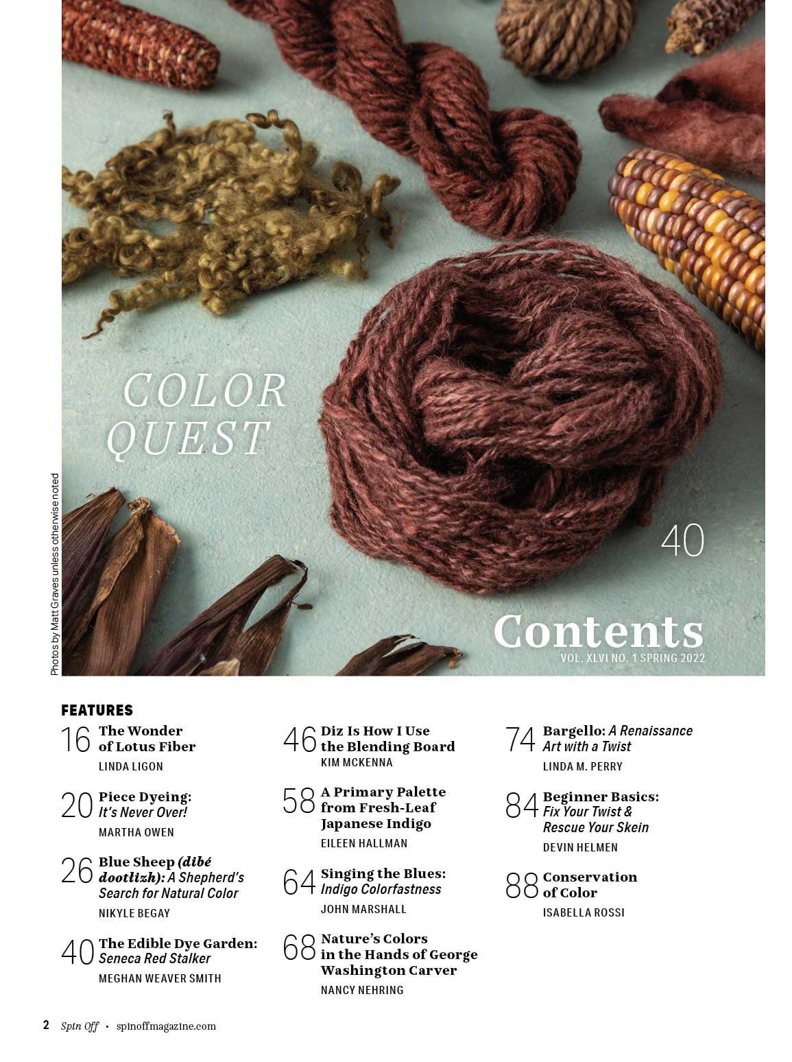 From earthy shades to ultra-saturated hues, few things excite spinners more than color. Delve into color explorations beyond the dyepot. Spin and knit a Swedish heart-warmer shawl using natural sheep colors. And discover tips for minimizing dye fading in your personal textiles.
