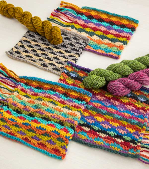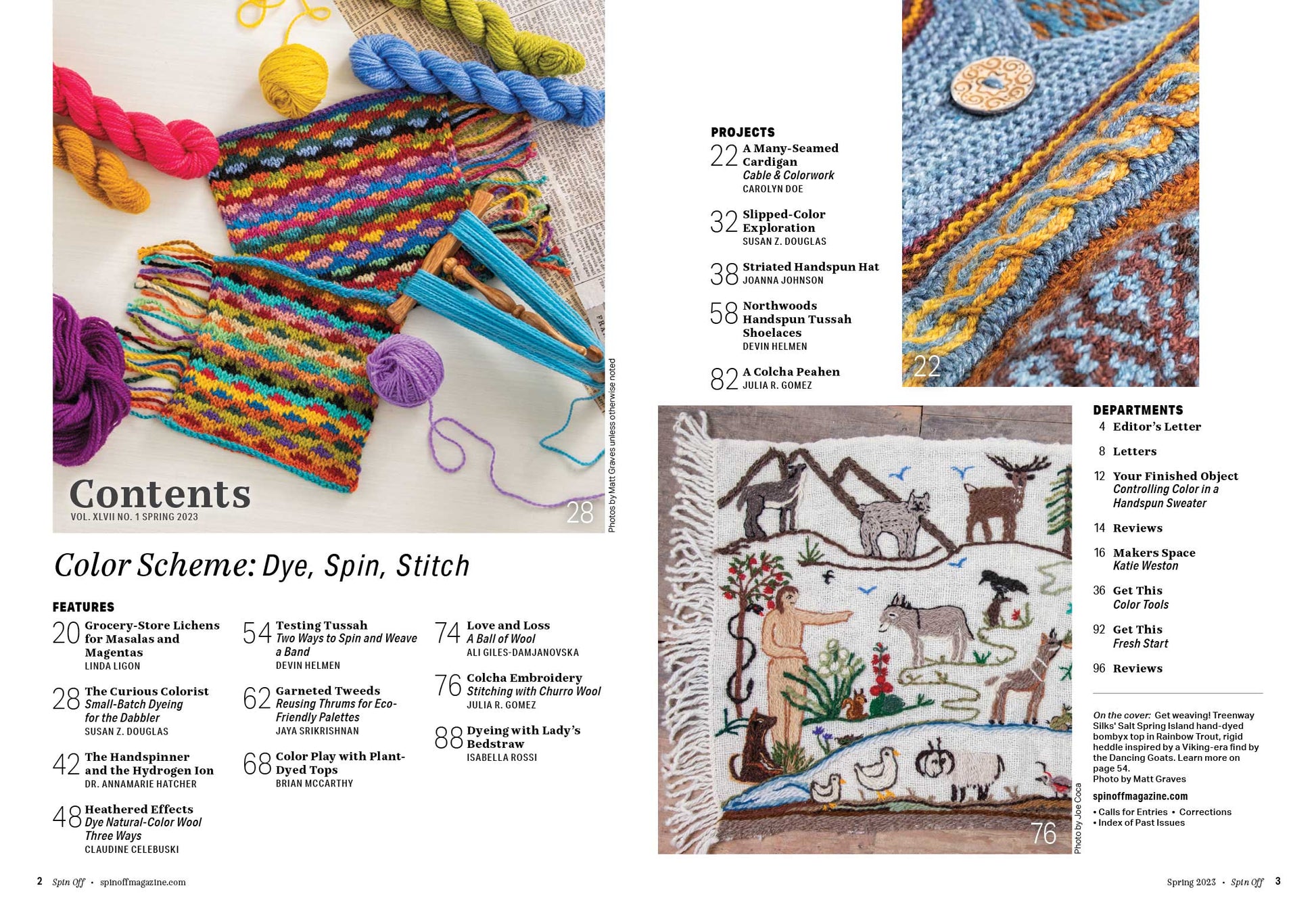 Our Color Scheme issue is all about putting color theory into play and practice! Follow an experiment in small-batch dyeing and see how the resulting colors interact in a knitted slip-stitch pattern that will keep you on your toes. Discover the importance of pH when dyeing protein fibers and learn how to measure pH activity at home. See how our authors explored heathered effects with natural-color fleeces, tweed yarns created with beloved thrums, multi-gradient handspun garments with a surprising approach to knitted construction, and more.