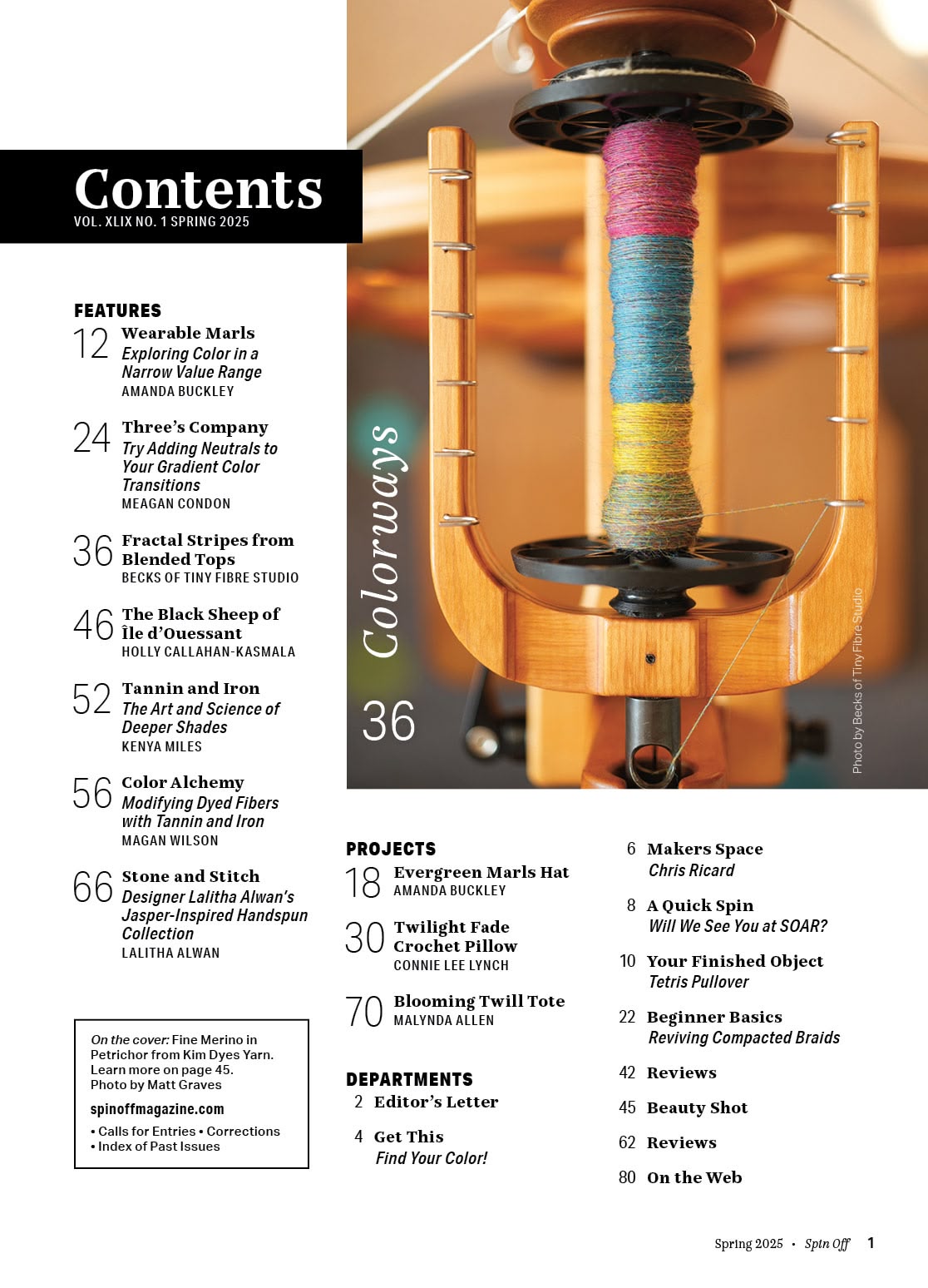 Join us as we celebrate color in all its beautiful forms in our fifth annual color issue. Whether you prefer naturally colored sheep’s wool or rainbow hues created by indie dyers, you’ll find plenty of inspiration for your next spin.