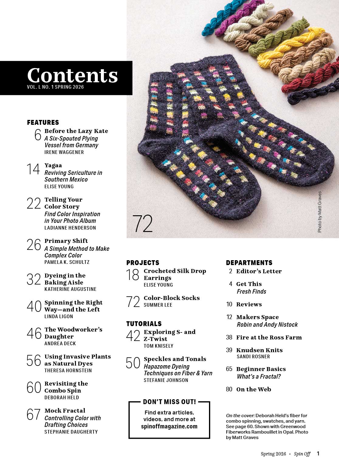 Travel through time and across the world with projects and articles that are sure to inspire you. Elise Young helps you show off precious handspun yarn with a pattern for micro-crochet earrings inspired by sericulture and natural dyeing traditions in Oaxaca. Tom Knisely uses a twist on a centuries-old technique for making simple woven cloth look complex, and Irene Waggener delves into an intriguing archaeological find.