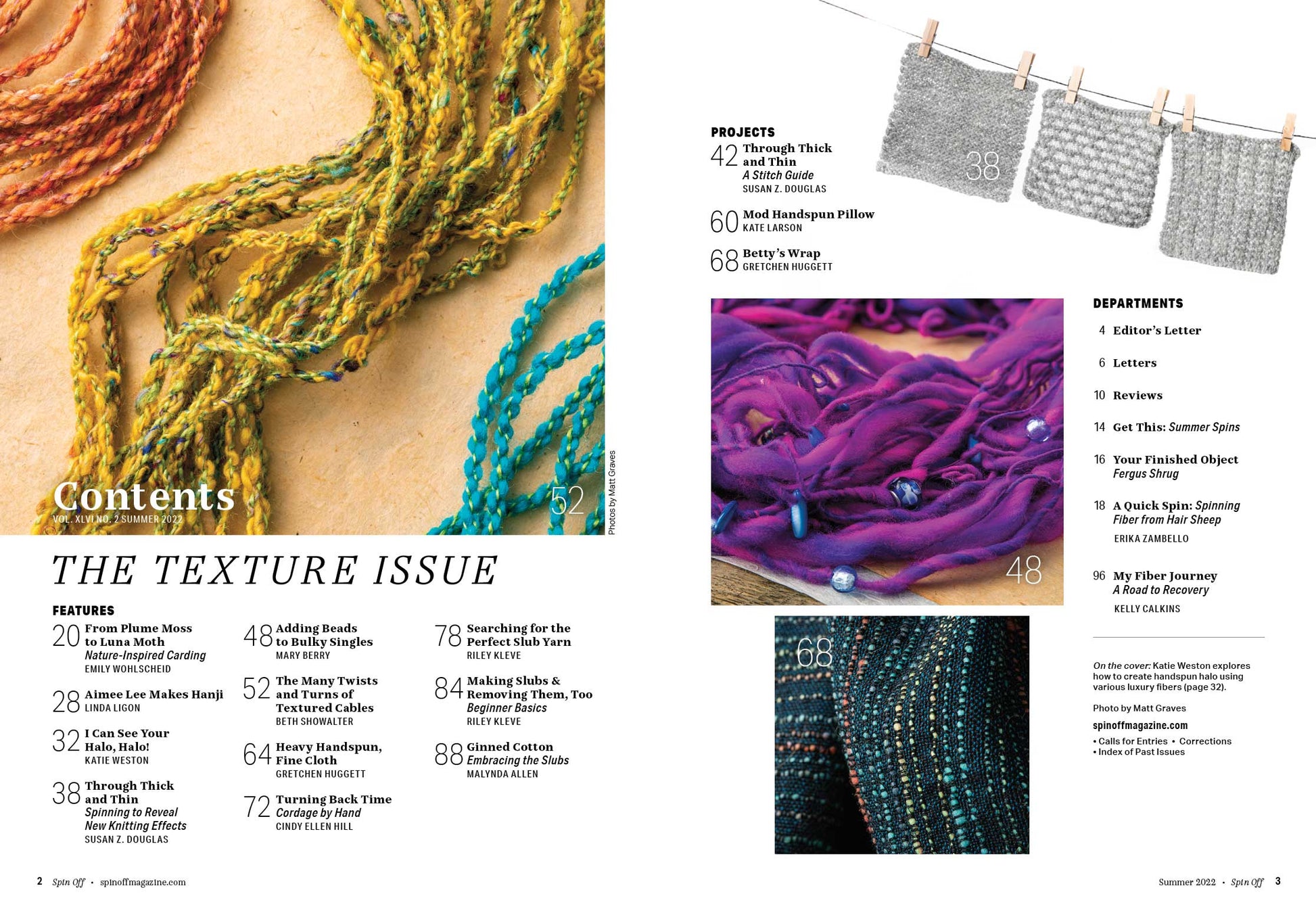 Join us for a deep dive into intentional texture, from smooth to slubby, silky to fuzzy. Explore ways to create, adapt, and use texture in your fibers, yarns, and finished textiles. Try creating handspun halo from four luxury fibers. Be inspired by 10 cabled-yarn variations. And learn how to avoid (or add!) slubs in your yarn.