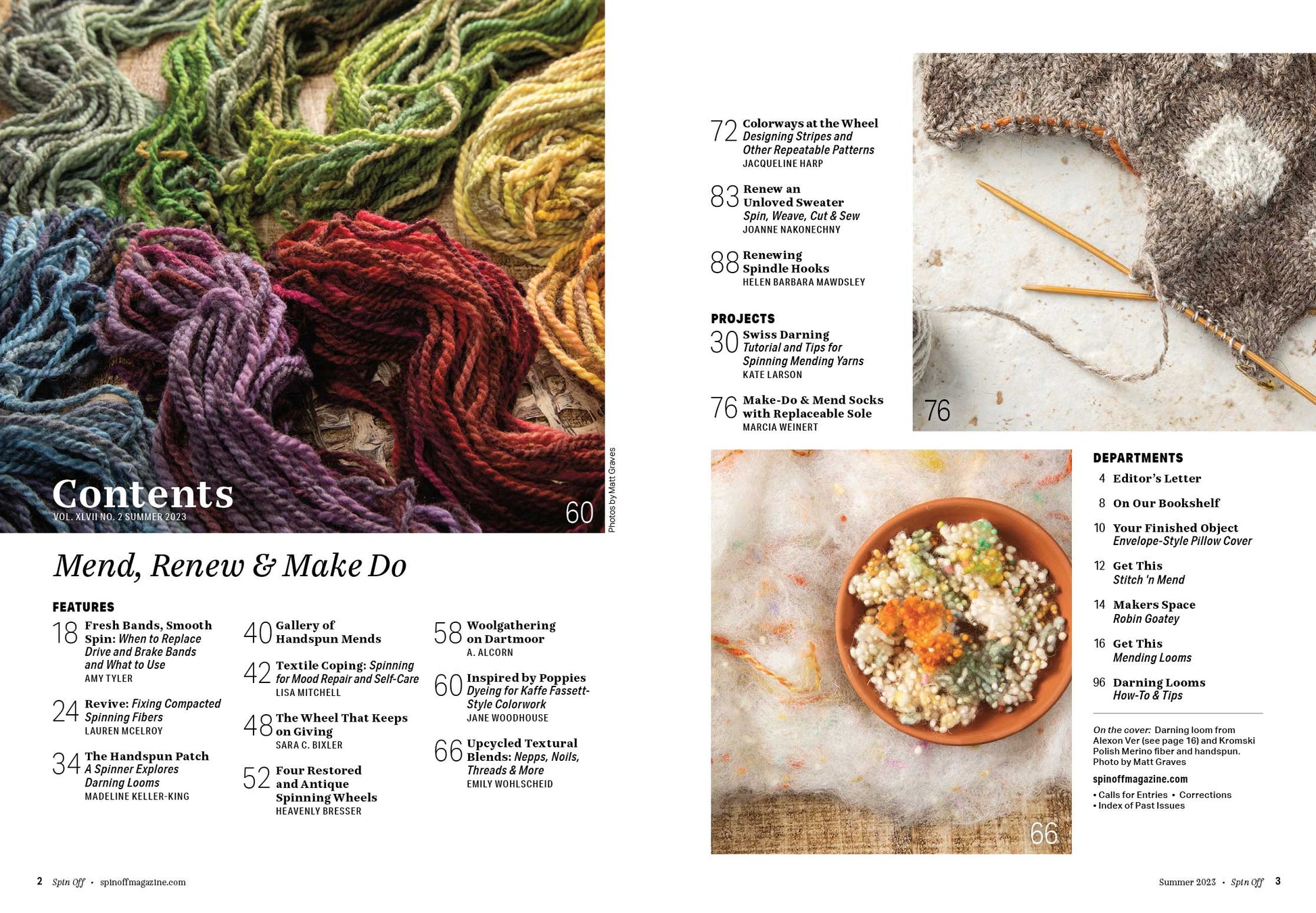 Our Summer issue recognizes that there are myriad ways that we, as spinners, can repair and improve the world around us. Read about how one art therapist and fiber farmer uses spinning for self-care. Learn when to replace drive and brake bands on your favorite wheel for a smoother spin. Discover how to revive your compacted spinning fibers by steaming, combing, and carding. And read about experimenting with different darning looms to mend a beloved sweater.