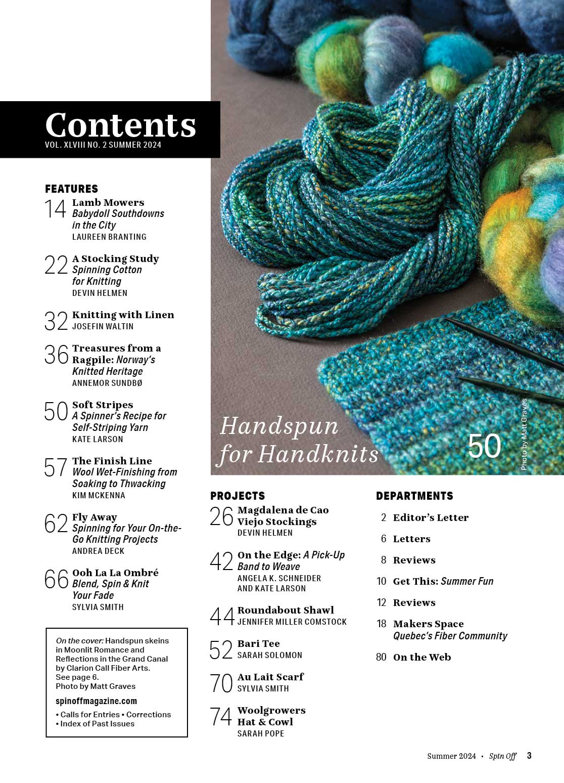 For this cheerful Summer issue of Spin Off, we chose “Handspun Handknits” to explore knitting and beyond. This issue connects you to spinners past and present working in a wide variety of fibers to create useful and beautiful cloth. Following their work helps you to explore new fibers and techniques or deepen your understanding of the familiar!