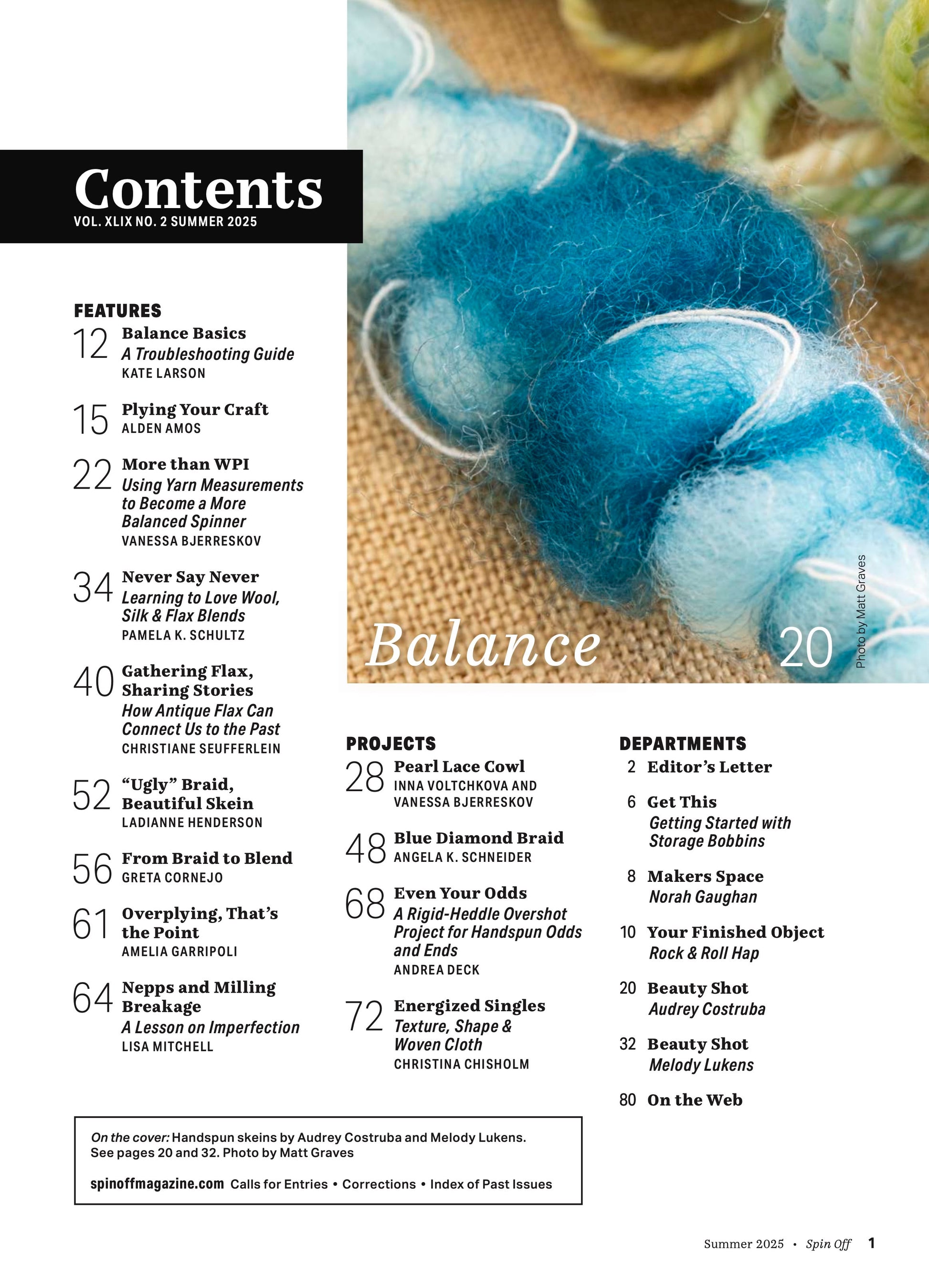 Balance in spinning is intensely personal, so to help you find your balance, this issue is full of tips from spinners who have found ways to spin balanced yarns of all kinds—and even some that are intentionally unbalanced! Join us as we dive into the rich history of antique flax and the vibrant global spinning community that has grown around it. Find helpful articles that will help you balance your yarn, no matter what you want to spin, plus a comprehensive guide on how to troubleshoot your twist when things don’t go quite as expected.
