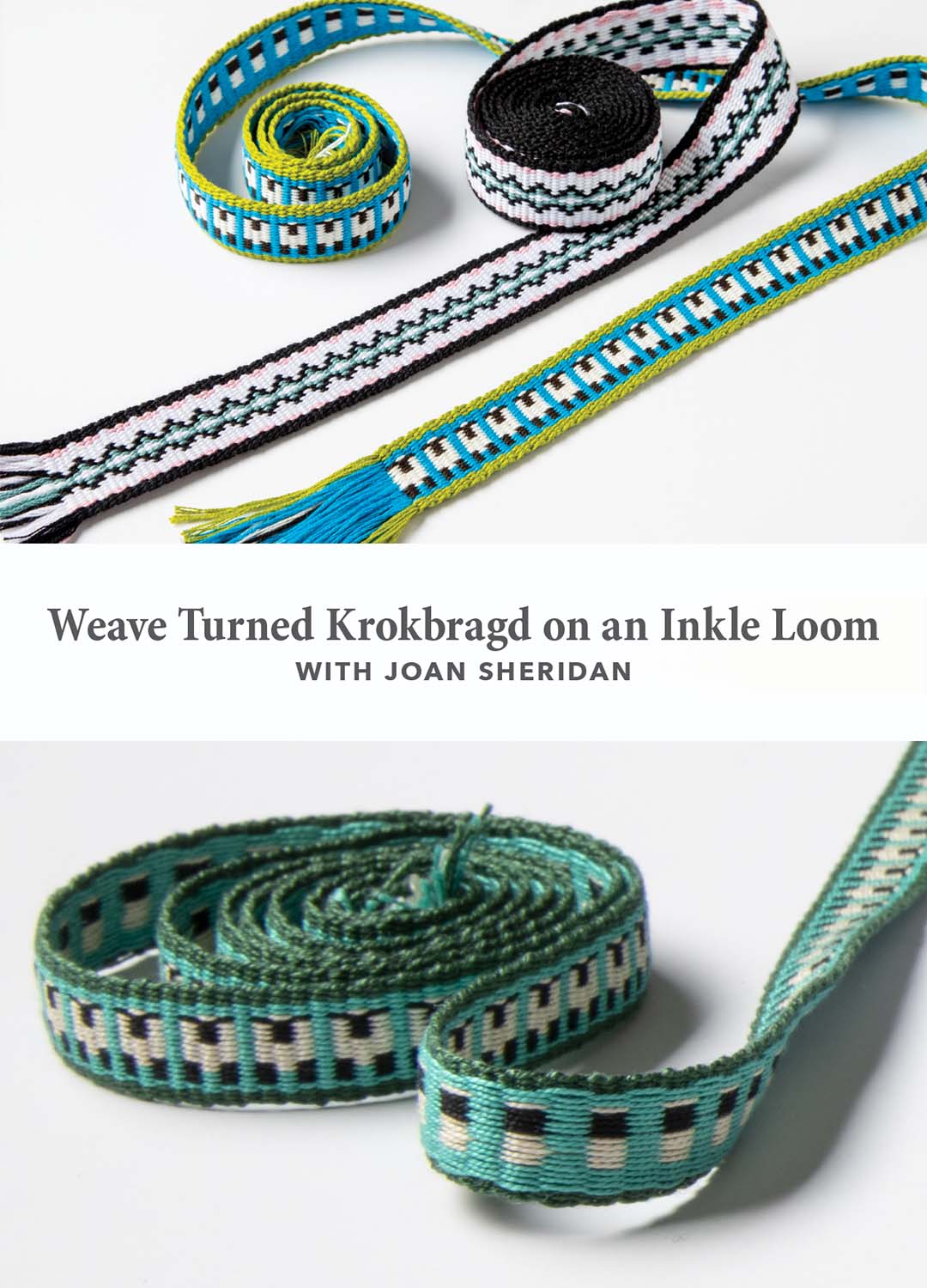 Using some simple additional string heddles to create a third shed, turned krokbragd is an easy, habit-forming way to make beautiful bands. Fiber artist and teacher Joan Sheridan walks you through this technique step by step, warping for a loom-controlled weave and creating the band pass by pass. By the end of the video, you’ll have a band of adorable woven sheep and the skills to make a more traditional motif.